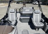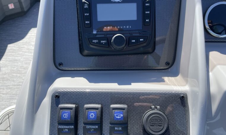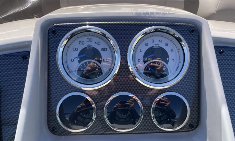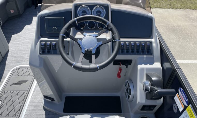 Standard Features include the following: HMX PR 25 Performance Package, Black Powder Coated Railes, Deck Trim, and Top Frame, Deck Cleats, Docking Lights, Extended Rear Deck, GPS Speedometer with Pigtail, Gussi Italia Rondinella Steering Wheel, High Back Helm Chair with Recline, Swivel, Slide and Armrests, West Sounds MC-5 Stereo with Bluetooth, Power Canopy, Ski Pylon, Wide-handle Stainless Steel 4-Step Telescoping Ladder, and Windscreen.