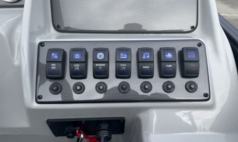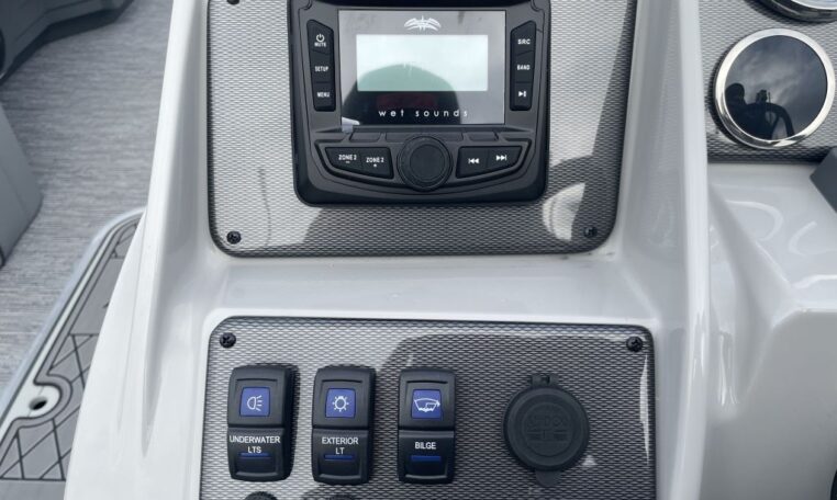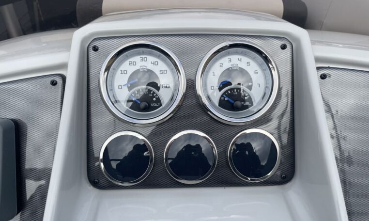 Standard Features include the following: HMX PR 25 Performance Package, Black Powder Coated Railes, Deck Trim, and Top Frame, Deck Cleats, Docking Lights, Extended Rear Deck, GPS Speedometer with Pigtail, Gussi Italia Rondinella Steering Wheel, High Back Helm Chair with Recline, Swivel, Slide and Armrests, West Sounds MC-5 Stereo with Bluetooth, Power Canopy, Ski Pylon, Wide-handle Stainless Steel 4-Step Telescoping Ladder, and Windscreen.